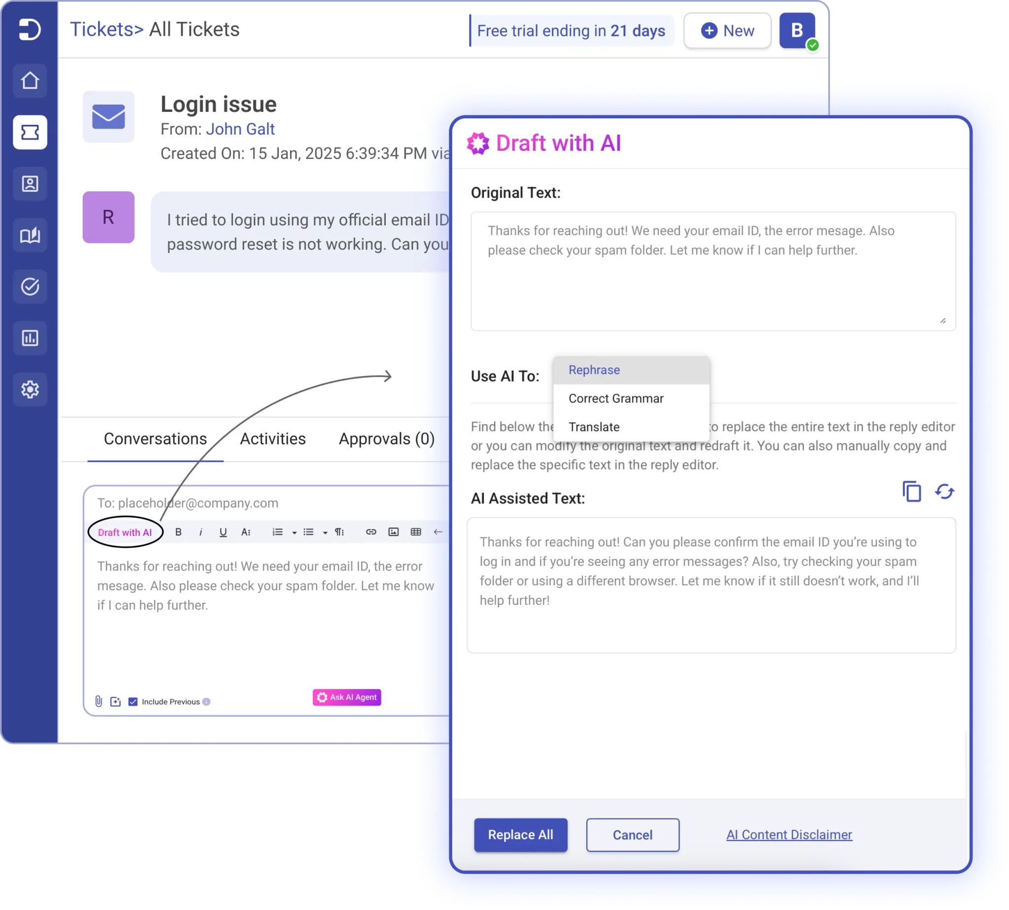 Easily convert ticket conversations into detailed, structured knowledge base articles using AI. Desk365 intelligently extracts key information from customer interactions, organizes it into a clear format, and helps expand your knowledge base.
