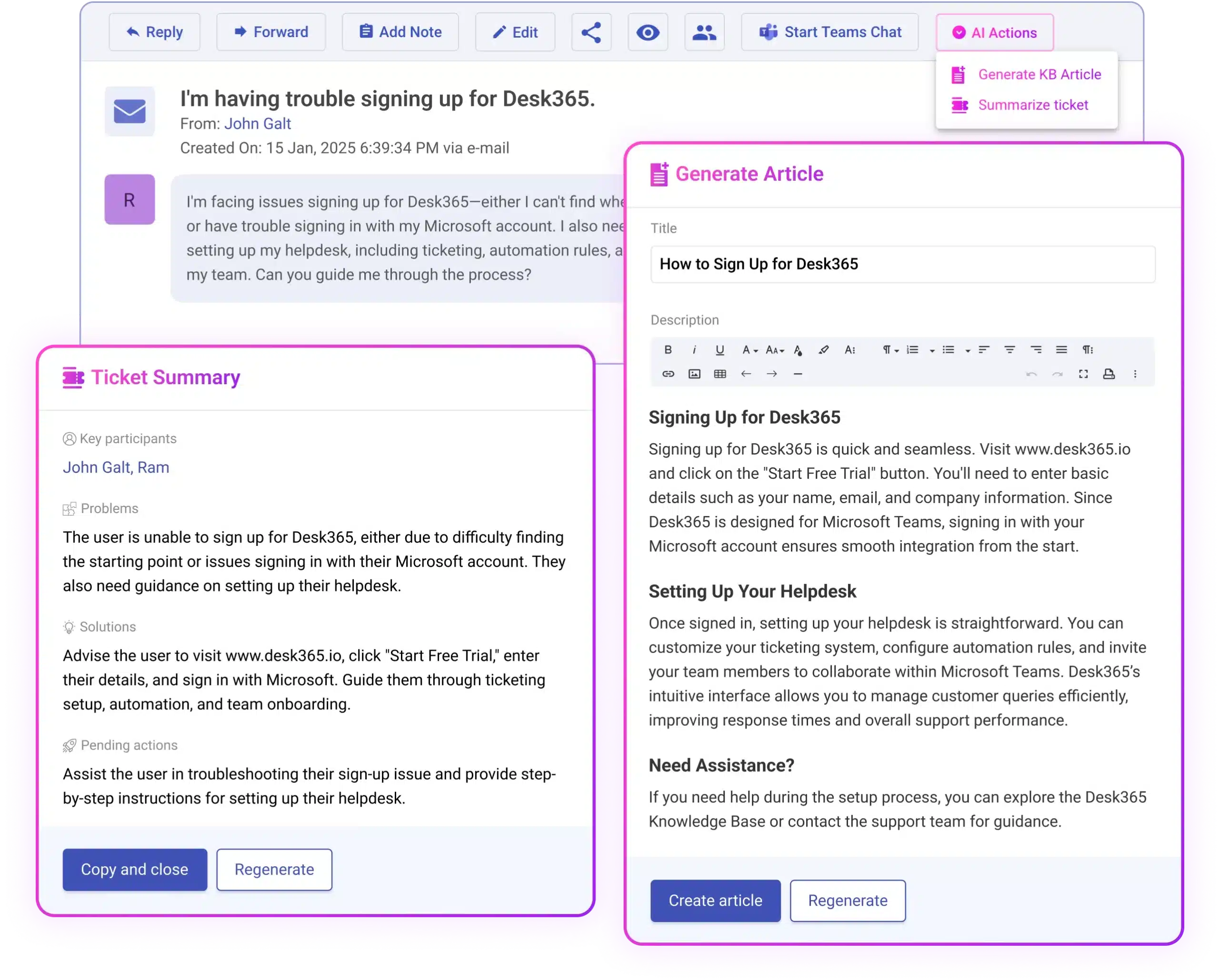 Let Desk365’s Al handle the busywork like drafting replies, summarizing tickets, creating KB articles, and translating conversations, so your agents can focus on complex issues.