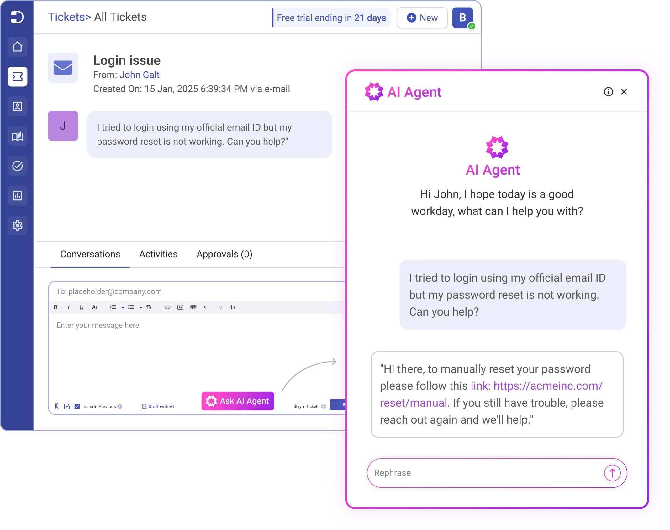 - With Desk365 AI Agent, your replies aren’t just generic—they’re tailored to the specific context of each ticket.