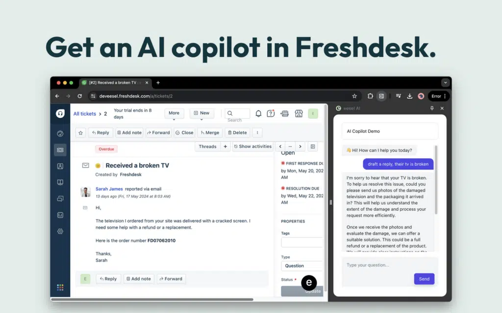 • Freddy AI – Freddy is an AI-powered virtual assistant that automates customer responses, categorizes and prioritizes tickets, and suggests solutions based on historical data.