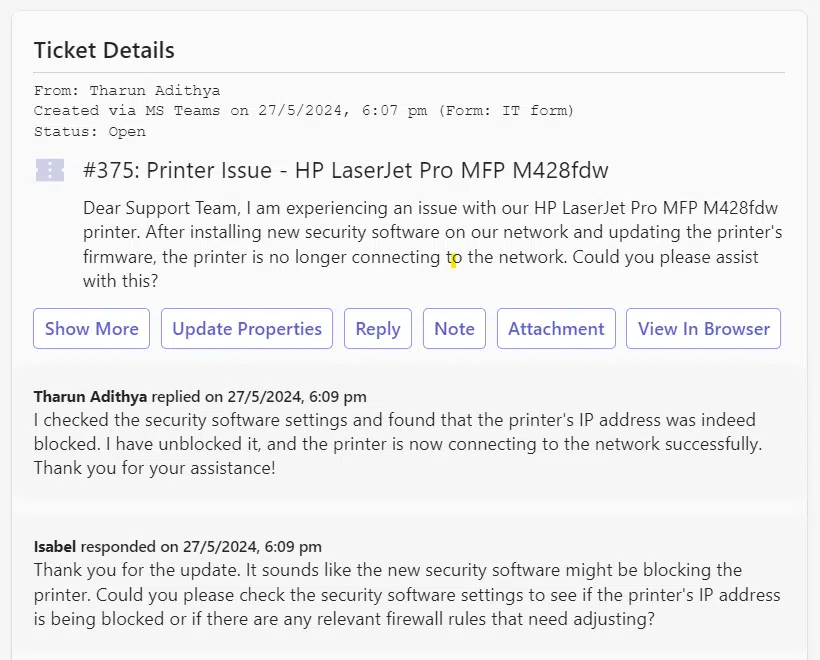 Integrating your helpdesk ticketing system with Teams allows support agents to respond to tickets using Teams’ built-in messaging capabilities. Agents receive notifications for new or updated tickets, enabling seamless communication with customers without switching between multiple applications.