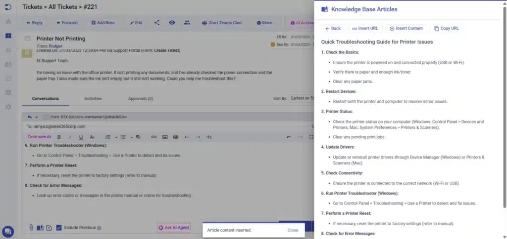 Desk365 now allows agents to seamlessly incorporate knowledge base articles into their ticket replies, making it easier to provide accurate and consistent information. By removing the need for manual searches, this feature speeds up response times and ensures customers receive accurate, well-documented solutions.