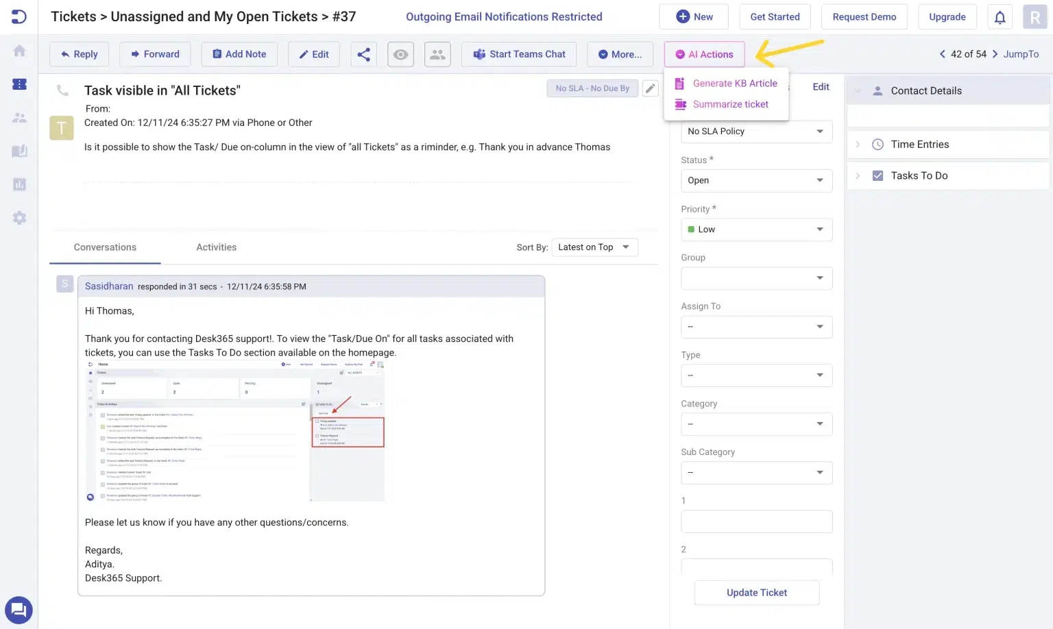 Desk365’s AI Actions is an advanced AI-powered feature designed to boost agent productivity by automating key support tasks. It streamlines ticket management by automatically generating knowledge base articles and summarizing lengthy ticket conversations, reducing manual effort and improving response efficiency.Â
