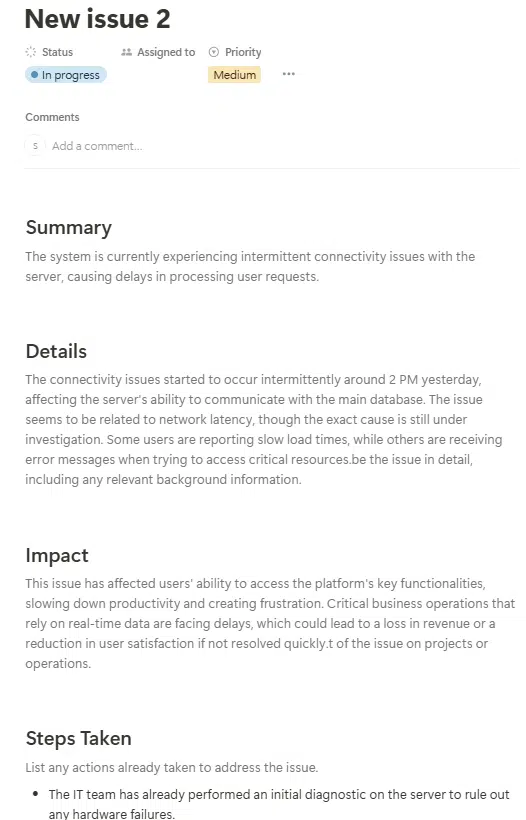 Notion allows you to add detailed notes, links, and even checklists within each ticket. This is useful for tracking the steps taken to resolve the issue.