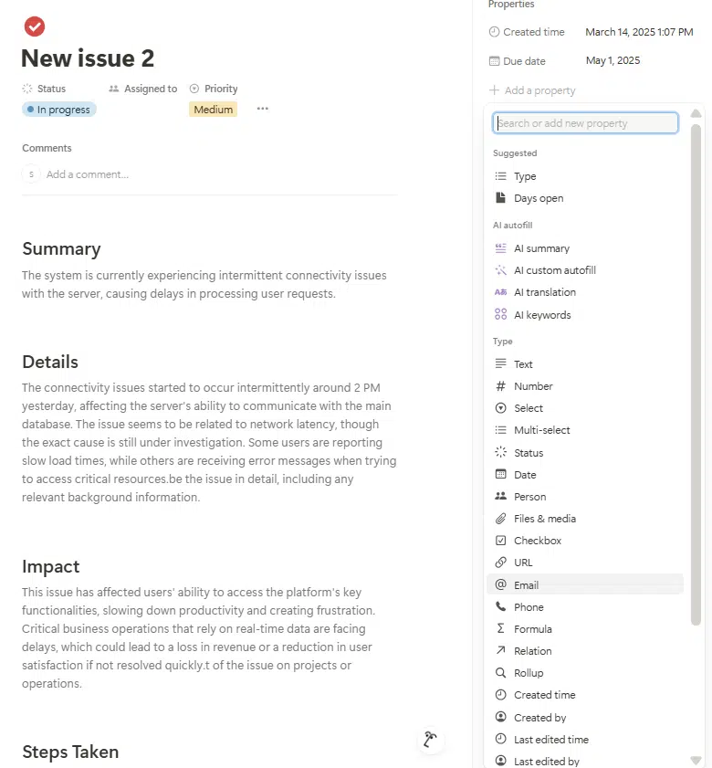 • Assignee: A “Person” property to assign the issue to the team member handling it.