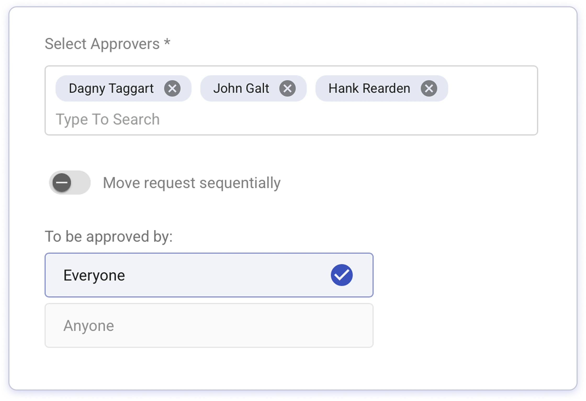 Everyone must approve: All stakeholders added to the request must collectively approve the request, only then the request would be considered as approved.