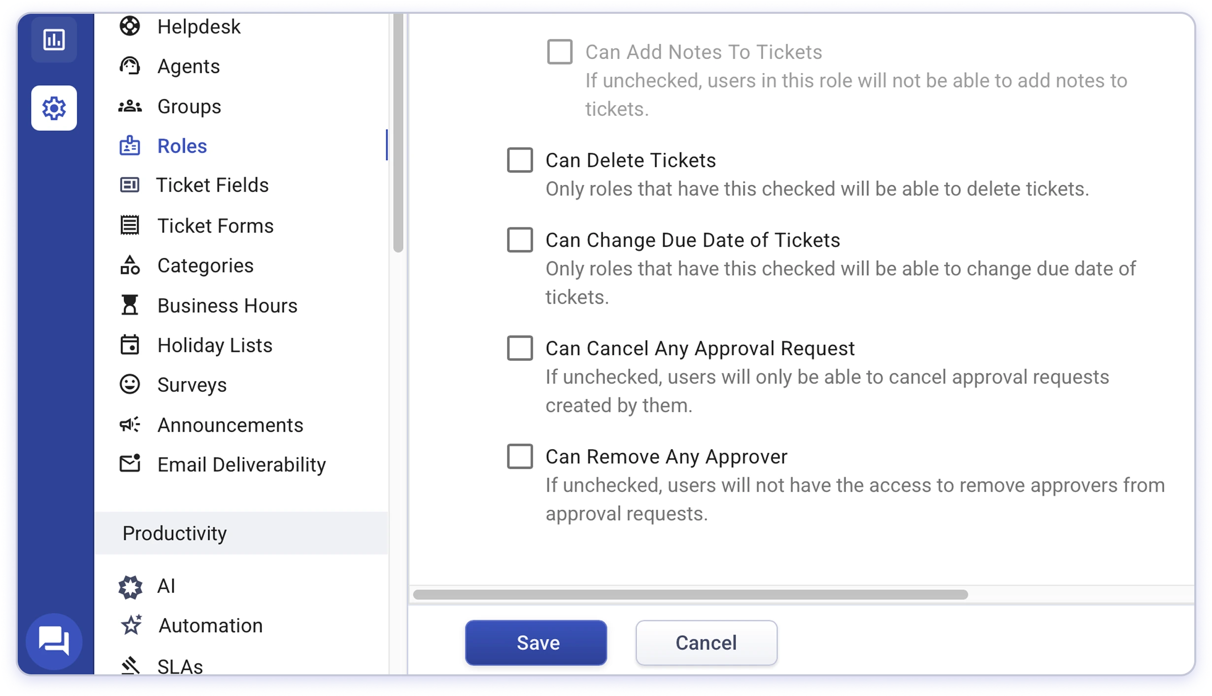 Maintain control over who can edit, cancel, or manage approvals. Assign temporary approvers without changing ticket assignments. Configure permissions at the admin or manager level to safeguard critical actions.