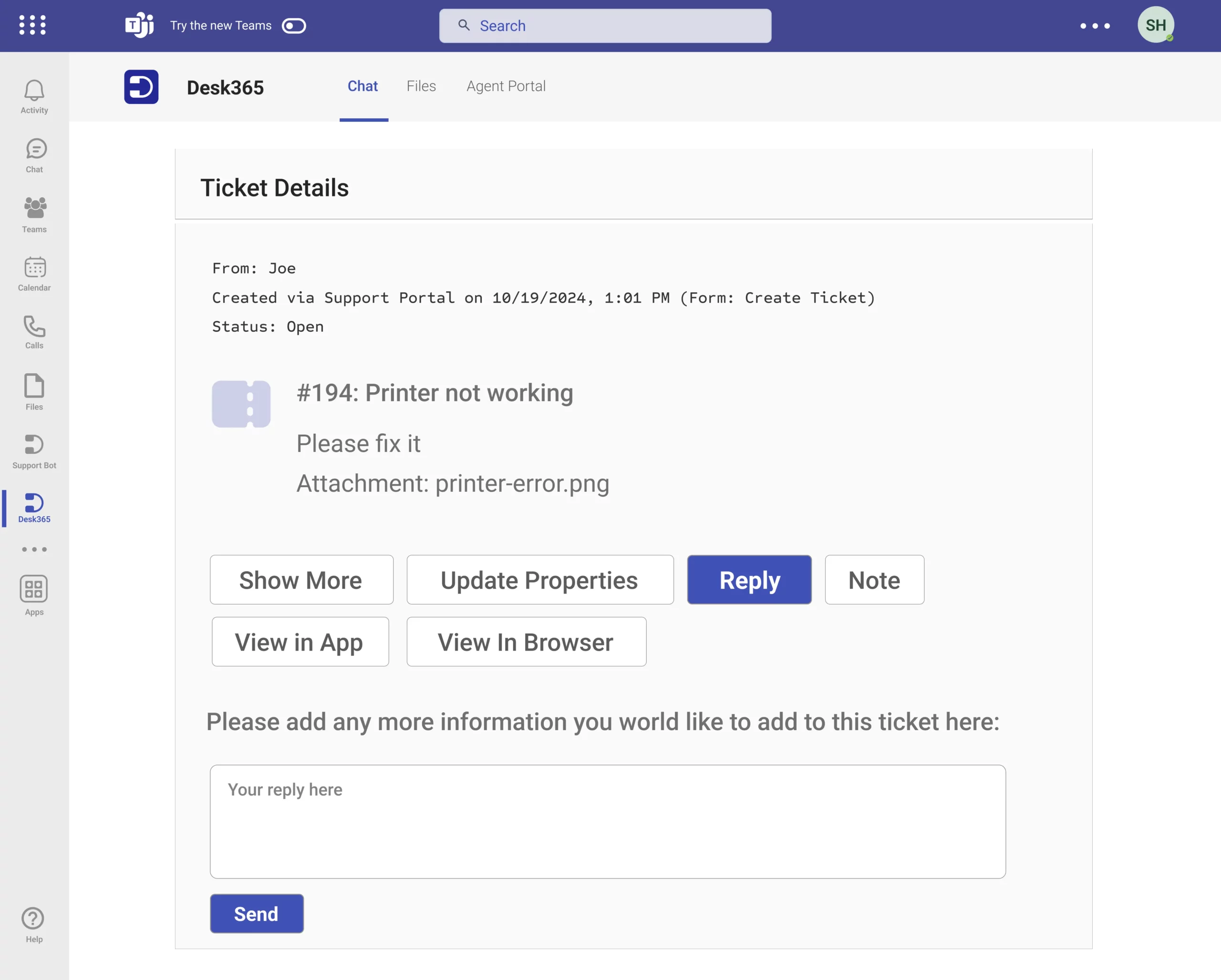 The Agent Bot helps your support team collaborate and respond better using the power of Microsoft Teams. They can assign tickets, add notes, check on statuses, change ticket properties, reply to customers, all without leaving Microsoft Teams!