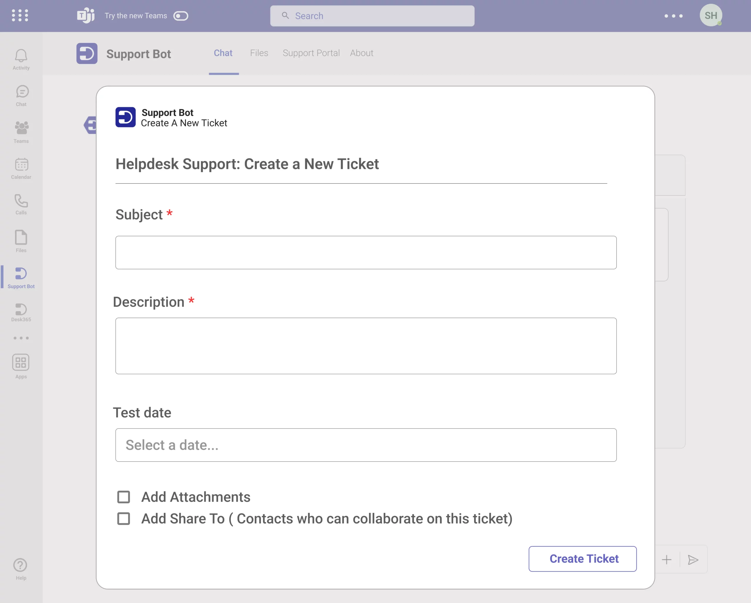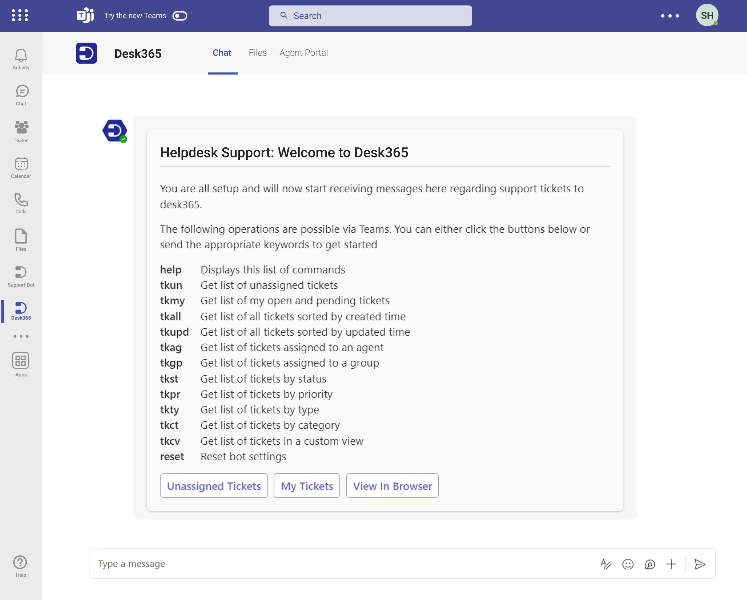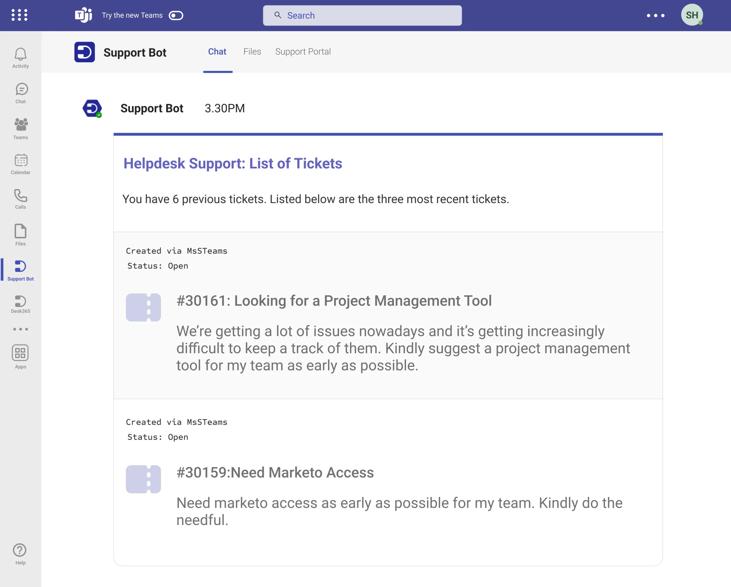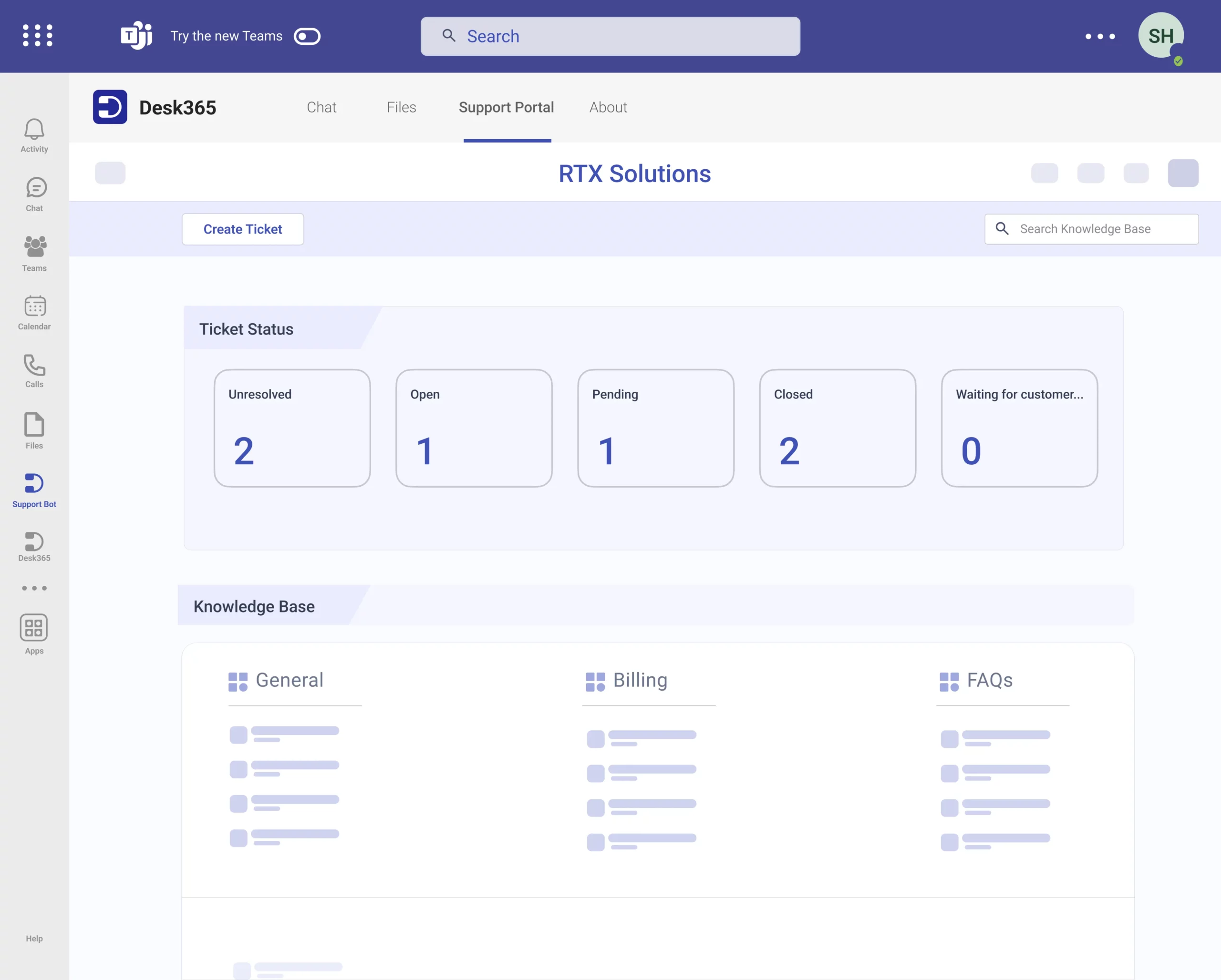 Make it easy for your end-users to get support without having to leave Microsoft Teams. Create tickets, check on status, and much more using the Desk365 Support Bot.
