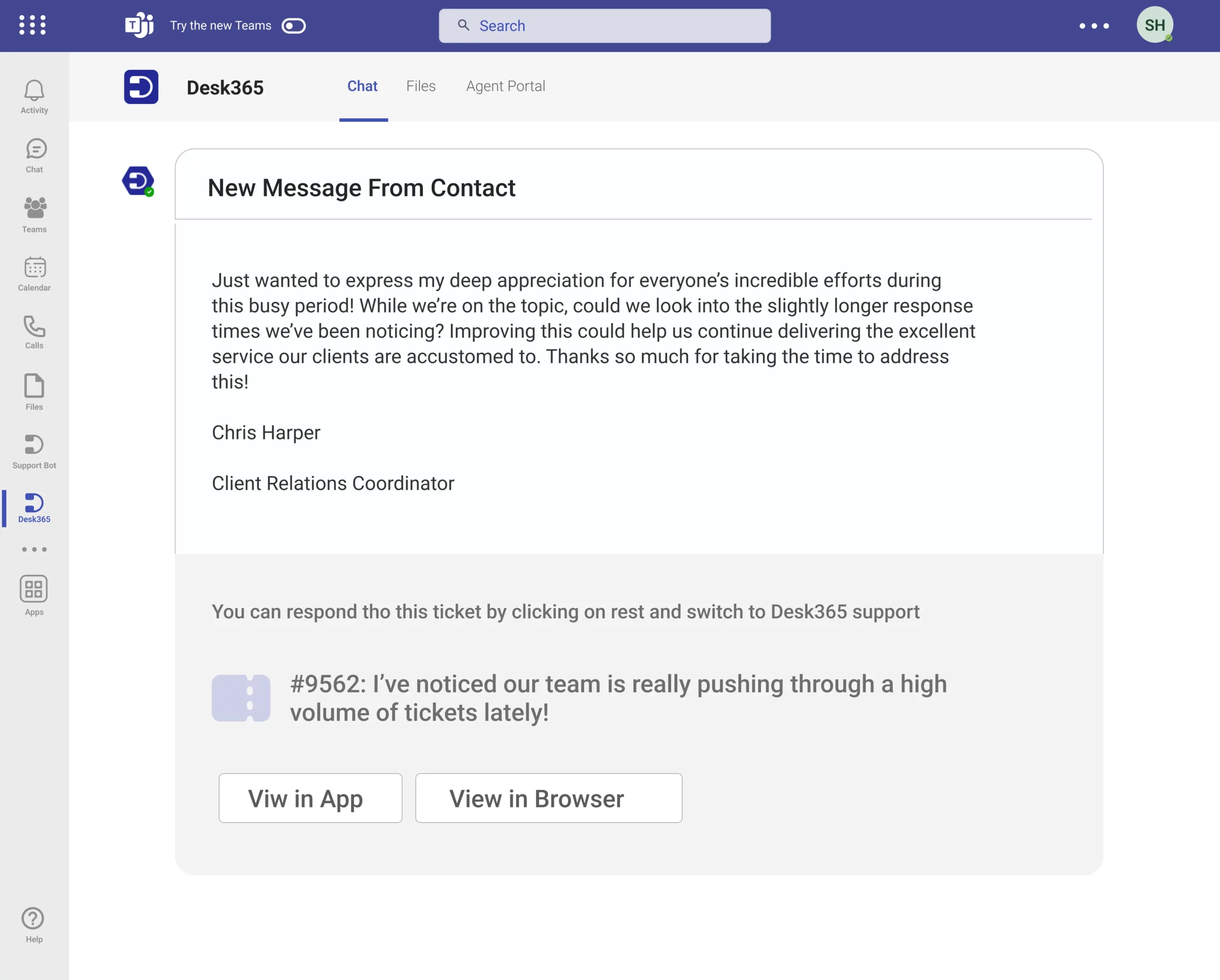 View tickets submitted through email, chat, support portal, and other channels directly in Microsoft Teams.